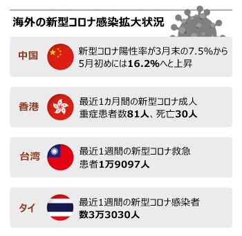 中国本土でも新型コロナが広がっている。中国疾病管理予防センターによると、今月4-10日にインフルエンザなどの呼吸器疾患が疑われる患者のうち、新型コロナと診断された割合は16.2%だったという。これは3月末の7.5%に比べると2倍以上だ。5月初めのメーデー連休期間中に移動と接触が増え、新型コロナ感染が速まったものと分析されている。
