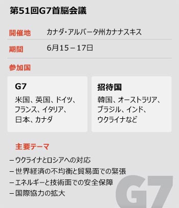 今回のG7首脳会議は世界の安全保障問題、エネルギー安全保障、人工知能(AI)、量子技術、未来に向けたパートナーシップなどがテーマになる。ロシアとの戦争が続くウクライナへの支援策、イスラエルとイランの戦争など中東問題、米中対立による中国のレアアース輸出規制なども話し合われる見通しだ。今回のG7首脳会議は第2次トランプ政権発足後はじめての開催となる。高い関税で世界に圧力をかけているトランプ大統領が西側主要国の首脳らにいかなるメッセージを出すかにも関心が集まる。「中国封じ込め」に力を入れるトランプ大統領はG7諸国にも対中圧力への参加を求めると予想されている。