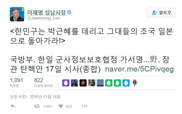 GSOMIA:城南市長「国防相は朴槿恵を連れて祖国日本へ帰れ」(1/1)