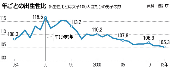 迷信の影響で1990年生まれは男女比116:100(1/1)