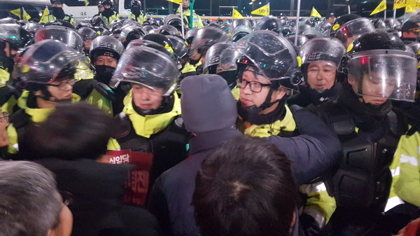 国政介入:「寒い中で苦労」 デモ隊が警察官を抱擁(1/1)