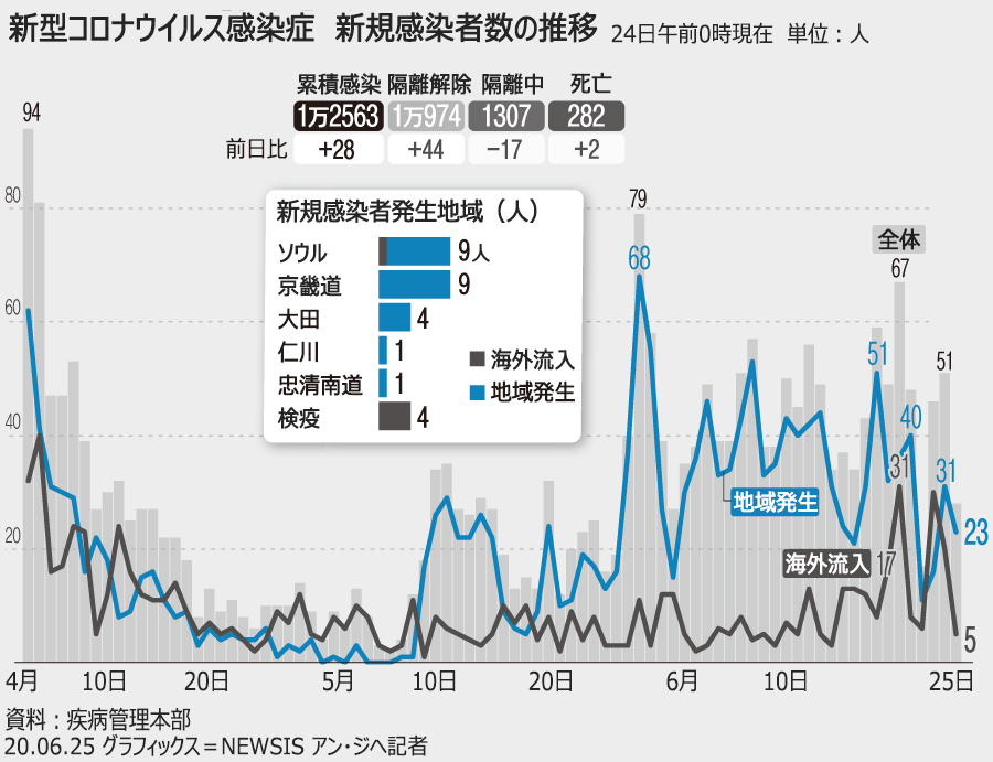 韓国の新型コロナ感染者28人増・死者1人増(25日0時)(1/1)