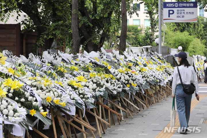 KBS前に並べられた葬儀用花輪…公営放送正常化求める(1/8)