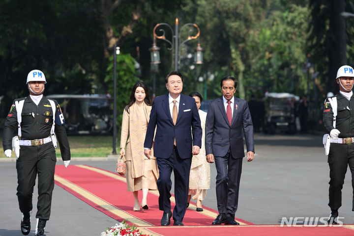 韓国大統領夫妻、インドネシア側の公式歓迎式典に出席(1/10)