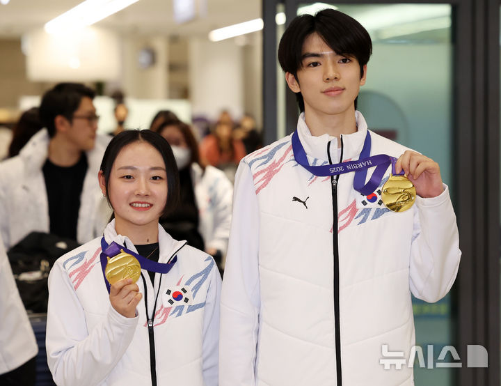 フィギュア:金メダルを披露する車俊煥と金彩然=冬季アジア大会(1/11)