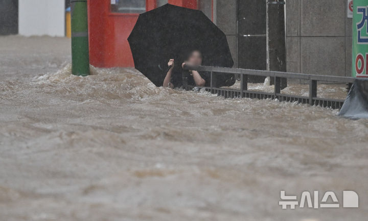 流されないように橋の欄干につかまり、救助を求める人 /光州(1/8)