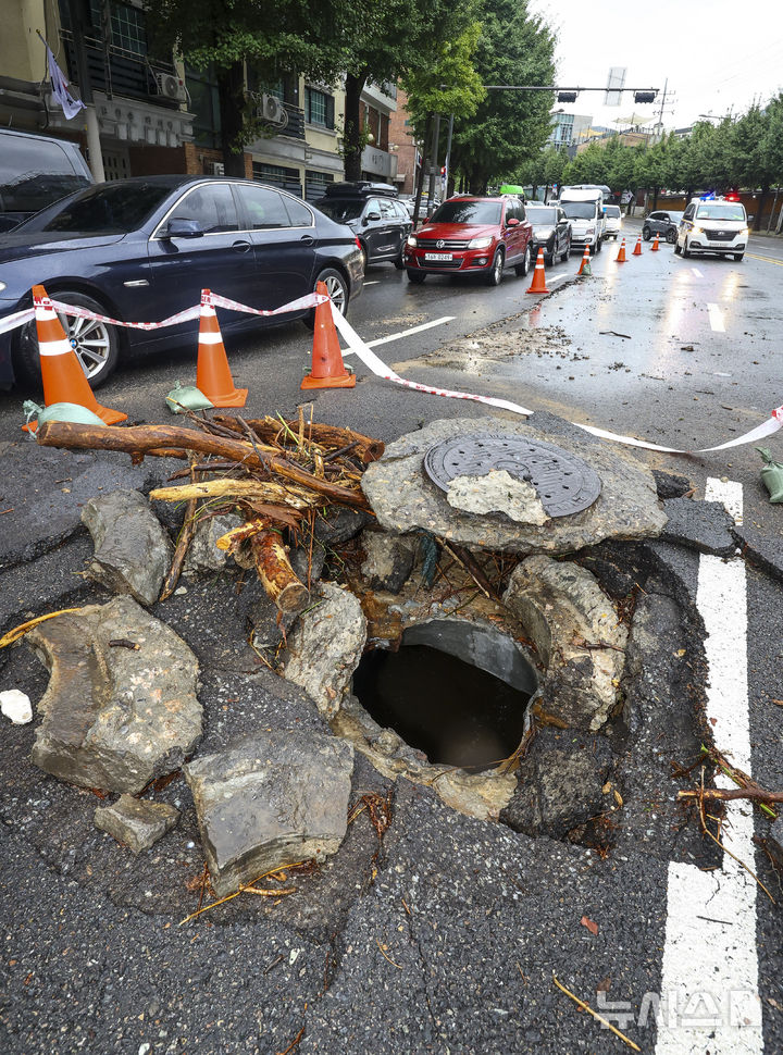 豪雨で破損したアスファルト(1/11)