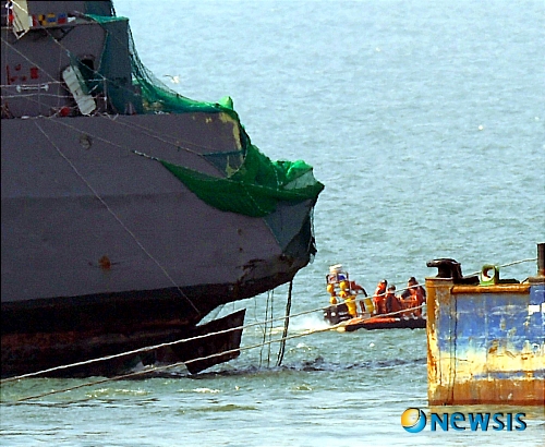 引き揚げられる「天安」船首(4/6)