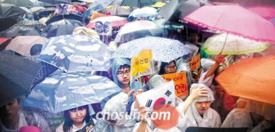 大雨の光復節、日本大使館前の集会に1000人(1/1)