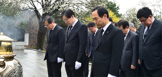 ポスコ役員ら、設立47周年で朴正熙・朴泰俊氏の墓参り(1/1)