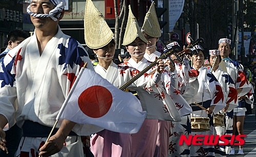 華やかにパレード=韓日交流おまつり(2/14)