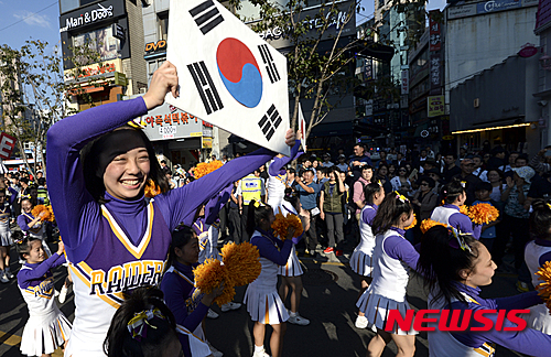 華やかにパレード=韓日交流おまつり(3/14)