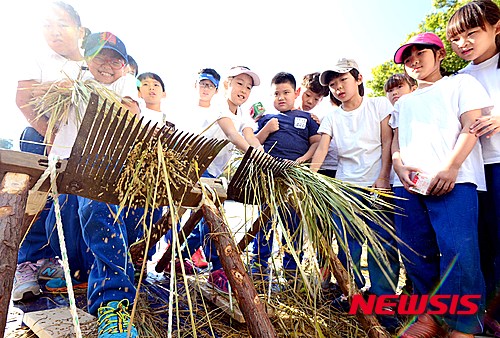 児童ら脱穀体験、自分たちで育てたコメ(2/5)