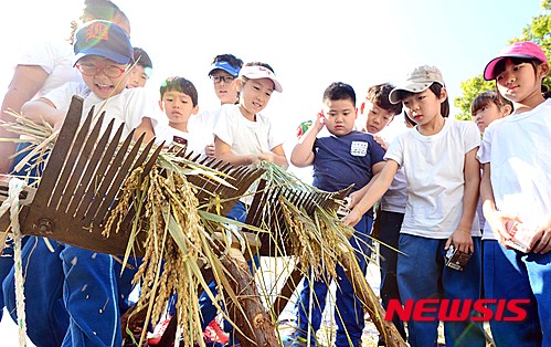 児童ら脱穀体験、自分たちで育てたコメ(3/5)