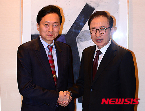 握手する李明博元大統領と鳩山由紀夫元首相(2/11)