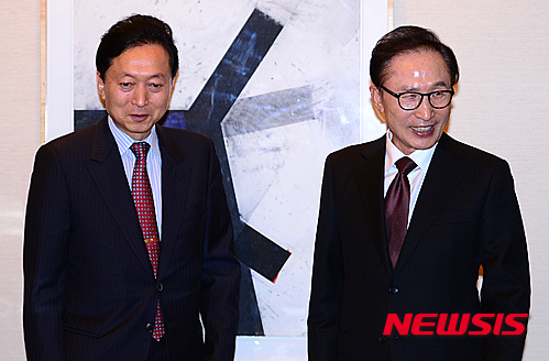 握手する李明博元大統領と鳩山由紀夫元首相(4/11)