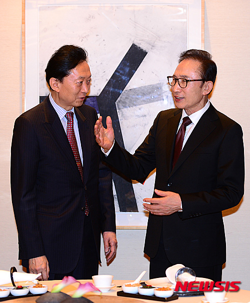 握手する李明博元大統領と鳩山由紀夫元首相(5/11)