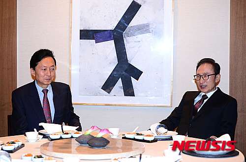 握手する李明博元大統領と鳩山由紀夫元首相(6/11)