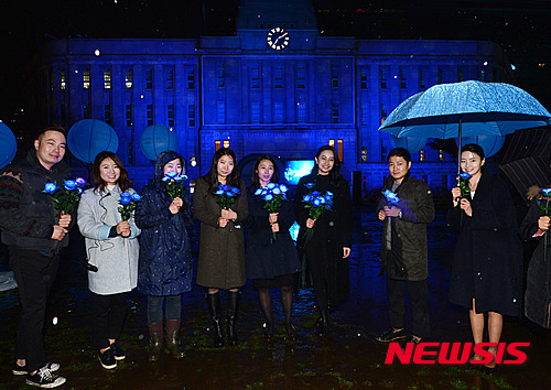 青一色にライトアップされた旧ソウル市庁舎(9/10)