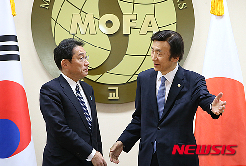 挨拶をかわす韓日外相(4/9)