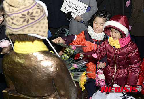 少女像に花を手向ける子どもたち(2/9)