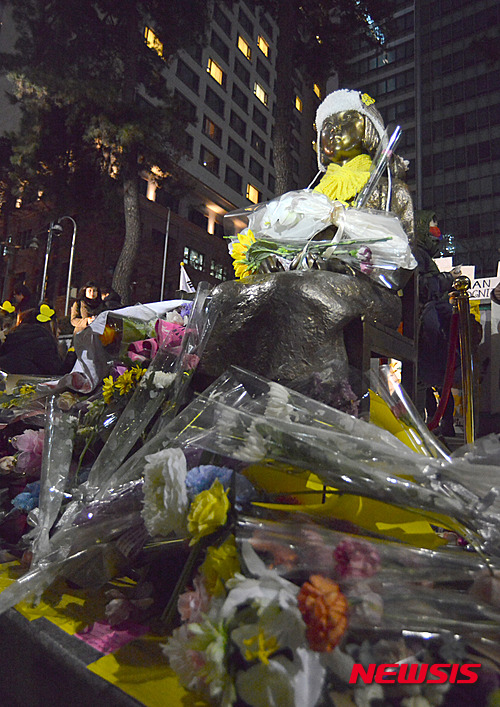 少女像に花を手向ける子どもたち(6/9)