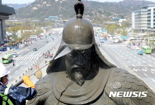 光化門の李舜臣像、シャワーですっきり(2/6)
