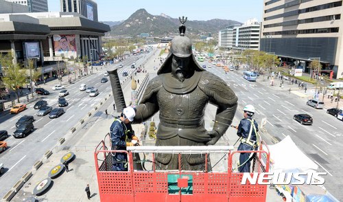 光化門の李舜臣像、シャワーですっきり(4/6)