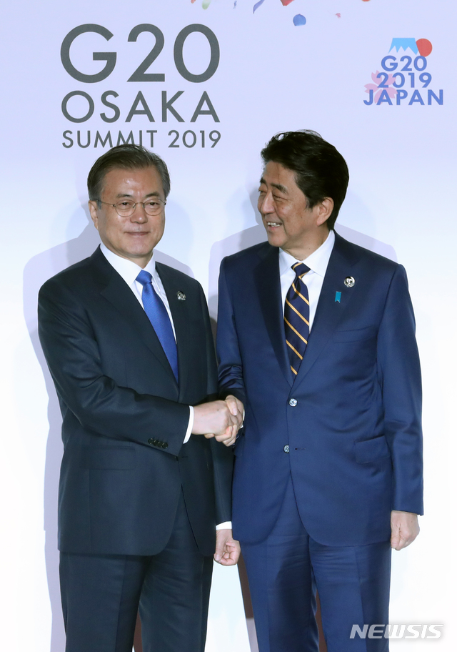 G20大阪:向かい合って握手する韓日首脳(4/12)