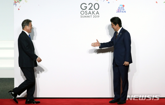 G20大阪:向かい合って握手する韓日首脳(9/12)