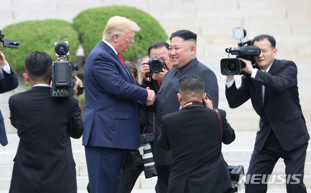 板門店の軍事境界線で対面した米朝首脳(4/21)