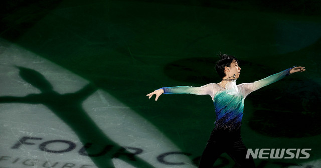 記念撮影する車俊煥×羽生×ブラウン=フィギュア四大陸選手権(11/19)