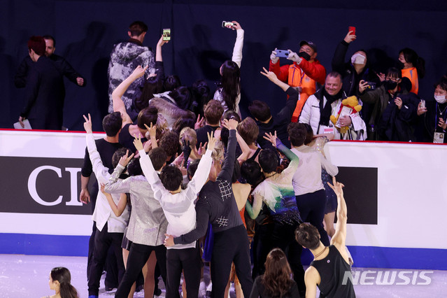 記念撮影する車俊煥×羽生×ブラウン=フィギュア四大陸選手権(4/19)