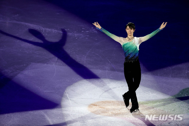 記念撮影する車俊煥×羽生×ブラウン=フィギュア四大陸選手権(8/19)