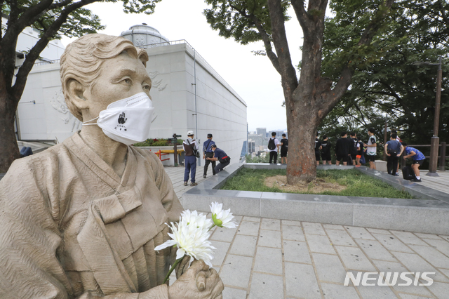 「日本軍慰安婦被害者をたたえる碑」に安重根の言葉を記したマスク(2/8)