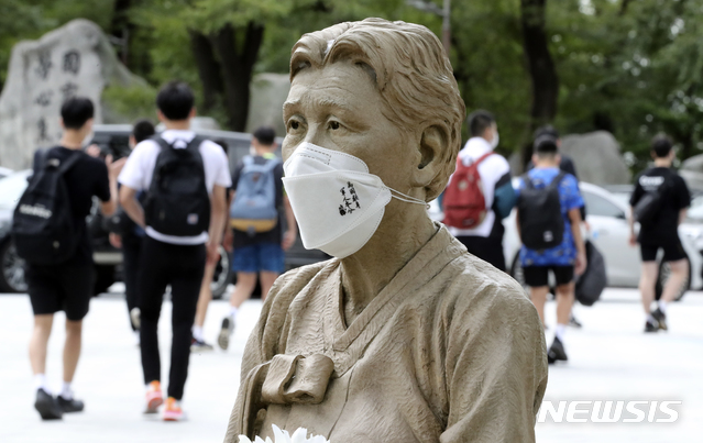 「日本軍慰安婦被害者をたたえる碑」に安重根の言葉を記したマスク(3/8)