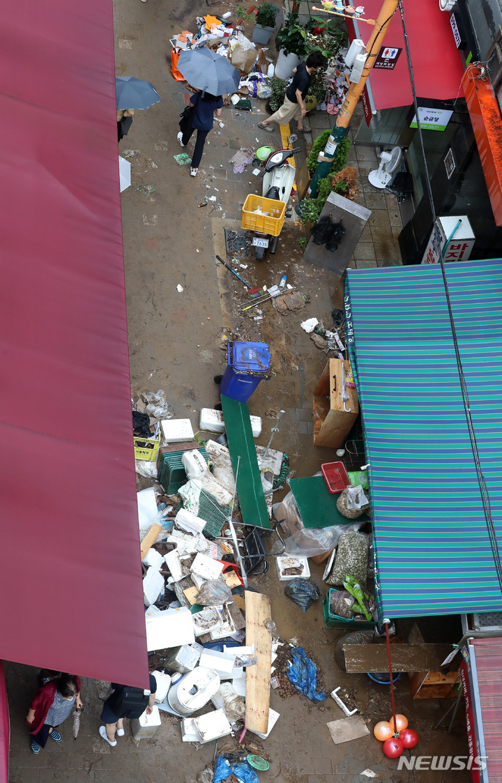 浸水被害にぼう然とする商店主たち /ソウル(7/15)