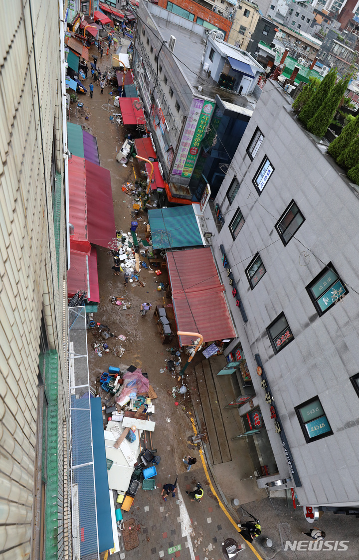 浸水被害にぼう然とする商店主たち /ソウル(8/15)