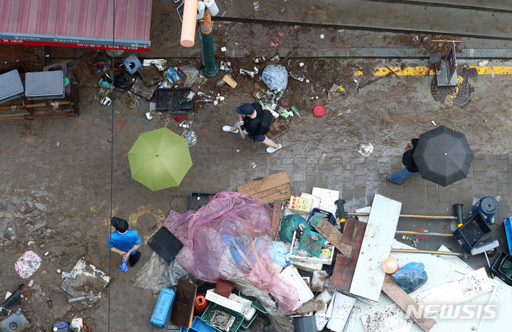 浸水被害にぼう然とする商店主たち /ソウル(10/15)