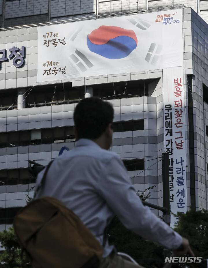 光復節と共に「建国節」と書かれた横断幕/ソウル(4/7)