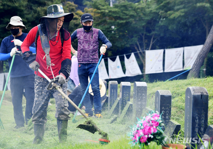 李韓烈烈士の墓で遺影をふく市民/光州(11/14)
