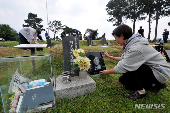 李韓烈烈士の墓で遺影をふく市民/光州(4/14)