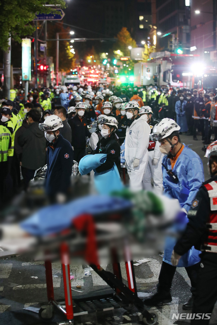 梨泰院の雑踏事故現場で死亡者を搬送する救急隊員たち(12/30)