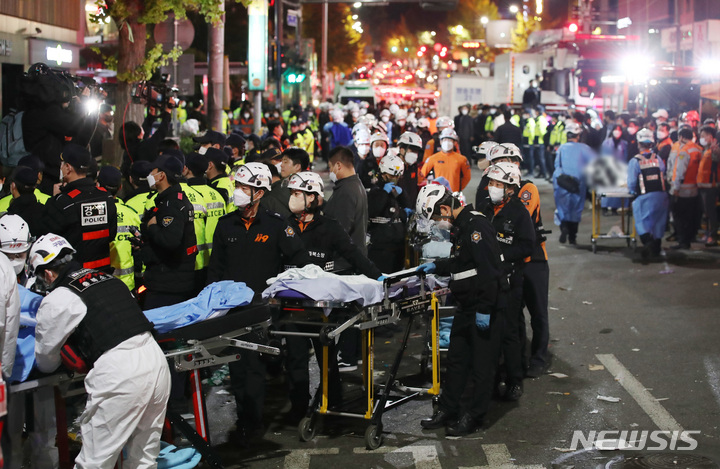 梨泰院の雑踏事故現場で死亡者を搬送する救急隊員たち(22/30)