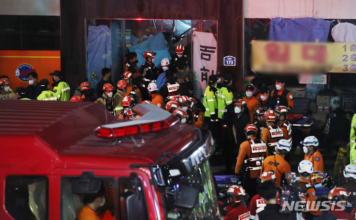 梨泰院の雑踏事故現場で死亡者を搬送する救急隊員たち(23/30)