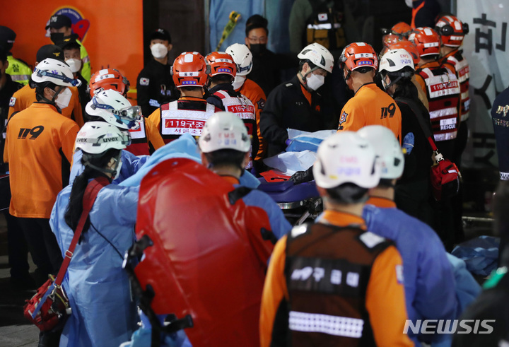 梨泰院の雑踏事故現場で死亡者を搬送する救急隊員たち(28/30)