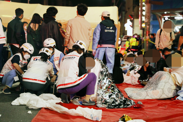 梨泰院の雑踏事故現場で死亡者を搬送する救急隊員たち(8/30)