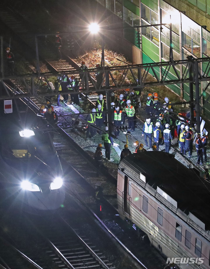 脱線列車の復旧作業に当たるKORAIL作業員たち/ソウル(12/13)