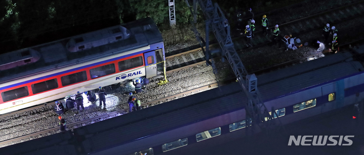 脱線列車の復旧作業に当たるKORAIL作業員たち/ソウル(3/13)