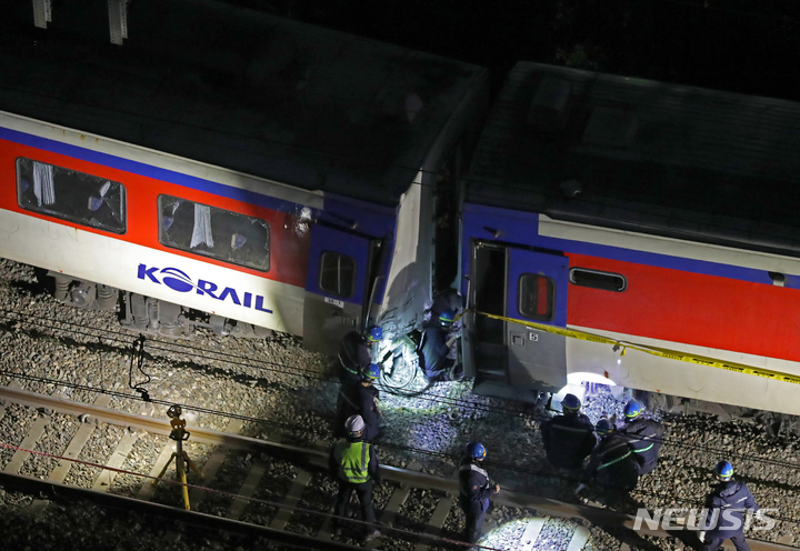 脱線列車の復旧作業に当たるKORAIL作業員たち/ソウル(4/13)